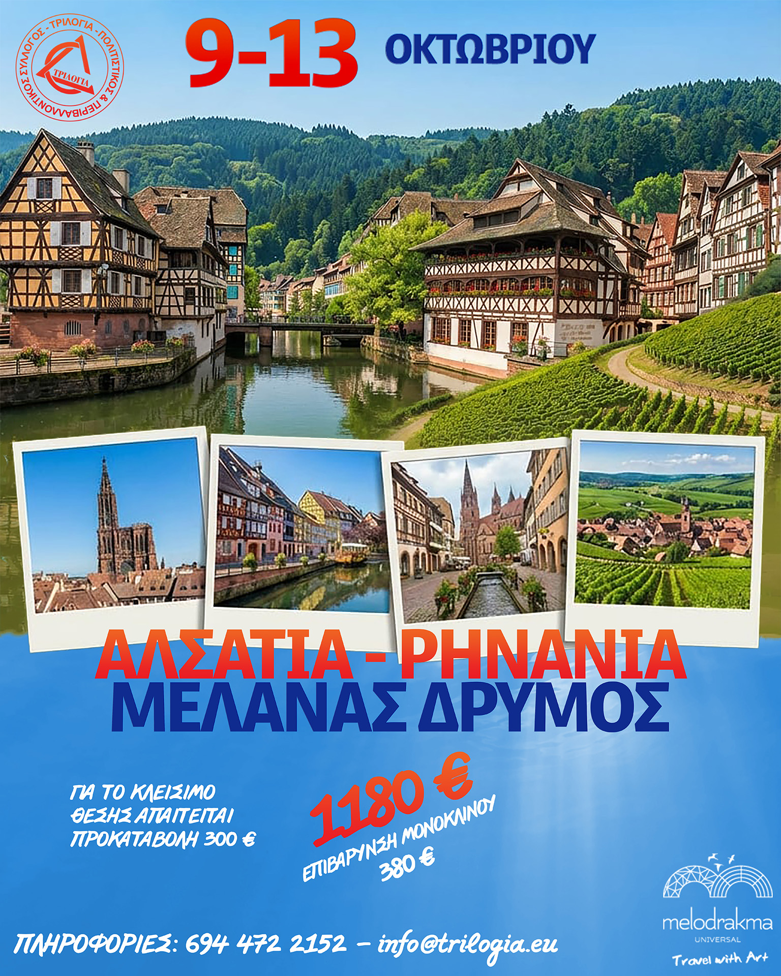 Από 9 έως 13 Οκτωβρίου ταξιδεύουμε στην Αλσατία, τη Ρηνανία και τον Μέλανα Δρυμό, σε μια διαδρομή γεμάτη ιστορία, πολιτισμό, φύση και μοναδικές εικόνες. Ένα ταξίδι που συνδυάζει τη γοητεία της γαλλικής Αλσατίας με τη φυσική ομορφιά και την αριστοκρατική παράδοση της νότιας Γερμανίας.